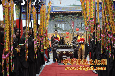 上午九点,在观音广场举行绕佛仪式,仪式上捧经人员在观音寺法师带领下,捧托经藏法宝,念诵南无本师释迦牟尼佛,绕佛完毕后将经书送入法坛,存入藏经阁。观音寺住持恒武法师主法为《大藏经》安放法法会洒净开光,随后进行上疏、回向。法会结束后,恒武法师开示,并祝愿新一年大家吉祥如意。