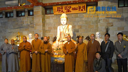 理因法师一行抵达华藏海大殿,即到坛城前捻香、礼佛为台湾祈福,随后由法藏法师带领参访团一行人认识开山大殿、法华洞等无生道场的景点。在法藏法师讲解开山圣殿的故事时,大家立即被玉佛前一排舍利子吸引目光,纷纷顶礼、跪拜,同声赞叹宝物的殊胜,更在开山圣殿内与舍利塔合影。