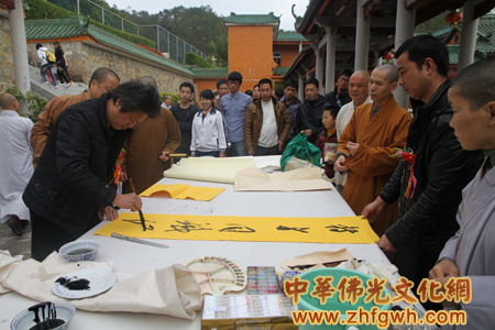《汕尾日报》社社长王万然先生也是三来定光寺的嘉宾、王社长向佛学院赠送了墨宝后,还现场挥毫创作。著名书法家黄丹先生也被众人围着挥毫留下了不少墨迹,佛学院学僧吟诵着女诗人杨碧绿老师新作《桫椤,桫椤》感染着余作明、林雅东、郑国传、叶九鼎、陈里纳、赖豪等书画家一行,尽情挥洒,顿觉翰墨飘香于这块人间净士。