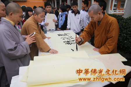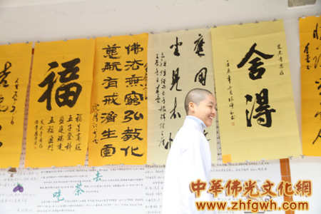 上午活动原计划定于11.30分暂停,但大家兴致浓烈,我不得不用麦克风一再请求暂停休息,延至12.30分大家才一起在斋堂用斋。众人心诚,兴之所致,刚放下斋碗,又马上走到文化长廊拿起了毛笔……大家胸中真情尽注笔端,今天不伹留了许多墨宝,更留下了片片虔诚之心。观众掌声、嘘唏表达了活动是多么的圆滿成功!来自全国各地的学僧们更是合十围赏着幅幅书画佳作,期盼着下届再续交流和学习机缘