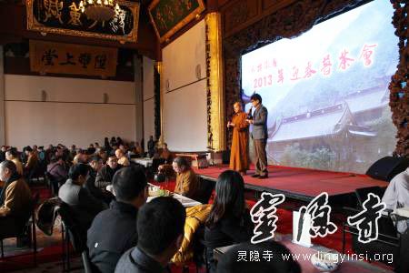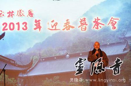 2013年1月20日下午,杭州灵隐寺“云林感恩·2013迎春普茶会”在直指堂举行,浙江省、杭州市统战部与宗教部门领导,杭州市、各县(区)佛教协会主要负责人,以及市属各大寺院的常住僧人与护法居士约200人参加了茶会,欢聚一堂,喜迎新春。茶会由灵隐寺副寺圣贤法师与杭州电视台主持人大年共同主持,市民宗局郭清晔局长、原浙江省委周国富副书记和灵隐寺方丈光泉法师分别在茶话会上讲话。
