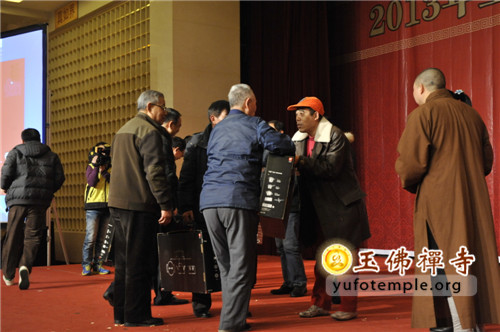 茶话晚会的节目全部由玉佛禅寺梵乐团编排,形式丰富多样,有精品佛曲联唱、有绕口令,有玉佛Style时尚表演,还有文渊法师、圣净法师及兄弟寺院法师表演的精彩节目,博得场下观众的阵阵掌声,不时插入的抽奖活动不断掀起高潮,整个会场气氛轻松愉快。晚会最后在觉醒大和尚为大家抽出特等奖的高潮中结束。觉醒大和尚也在新春佳节即将来临之际,虔诚的祈愿诸佛护佑,祥光普照,国泰民安,社会和谐,并祝与会领导嘉宾,护法居士蛇年大吉,身体健康,心想事成,万事如意!