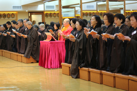 香港佛光道场2013年度首次八十八佛共修法会于1月20日举行,经过整整一年的推动与鼓励,信众们愈来愈多人懂得善用法会前的时段于修持中心进行自课修持。10时整,近三百位信众在监寺满乐法师及诸位法师的引领下礼忏共修。