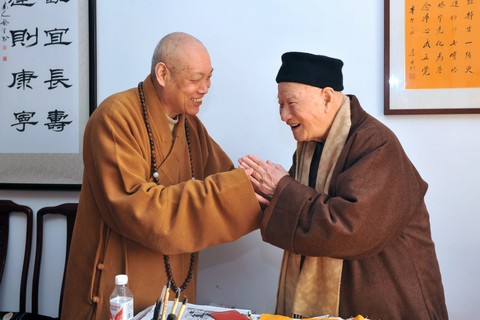 图9:佛协会长道慈大和尚(左)在普济禅寺慰问咨议委主席道生长老(右)