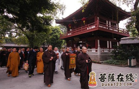 中国佛教协会副会长、光孝寺方丈明生大和尚率寺内僧众、居士在山门口列队迎接,并招待来宾于甘露坊享用午宴。