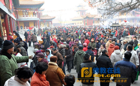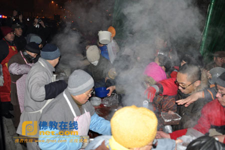 2013年1月19日,壬辰年腊月初八,是本师释迦牟尼佛成道吉日,天津市荐福观音寺隆重举行祝圣仪式暨腊八施粥大法会。寺内300余名义工经过一夜的烹煮,制作出由五谷和精致配料的腊八粥与吉祥饺,近万名信众市民随喜道场,大家满怀喜悦,感受腊八粥寓意的吉祥、增福和圆满。