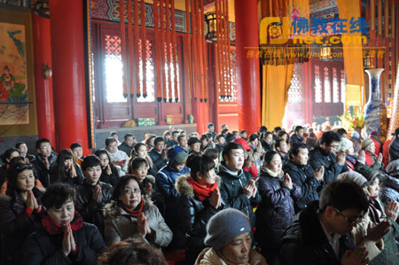全天寺内举行了金刚经道场,下午荐福观音寺住持妙贤法师还亲自为近1000名信众举行了三皈依仪式,天津市区领导到荐福观音寺祝贺佛教节日并品尝了腊八粥。