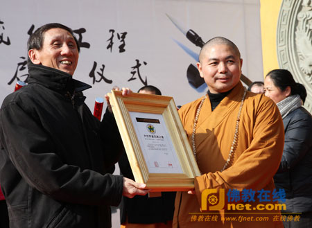 上海大世界基尼斯总部总经理王以卓先生向曹王禅寺颁发证书