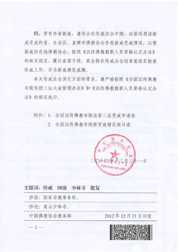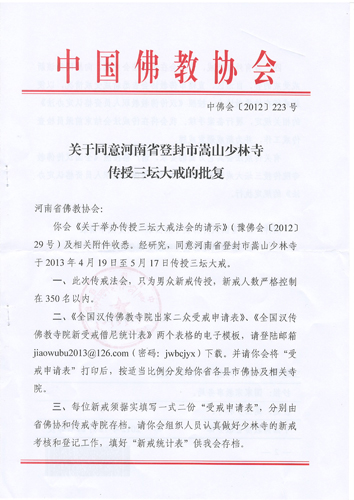 河南登封嵩山少林寺将于2013年4月19日至5月17日举办传授三坛大戒法会。