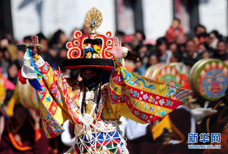 2013年2月23日,甘肃省夏河县拉卜楞寺举行了一年一度的跳金刚舞法会,这是当地正月法会当中的一项重要宗教民俗活动。数万名身着节日盛装的信教群众和游客聚集在拉卜楞寺的大经堂广场周围。庄严的法乐响起后,法舞开始,在僧人乐队的伴奏下,头戴面具的30余名僧人,通过旋转跳跃的舞蹈,形象地向观众们讲述宗教故事。法舞即金刚舞具有早期藏族舞蹈的风姿,是一种粗犷、豪放、拟人化的表演。它的突出特点是通过面具,形象地介绍人物身份、善恶角色。这种舞蹈跳跃幅度大、旋转多,借鉴了民间舞蹈的风格。