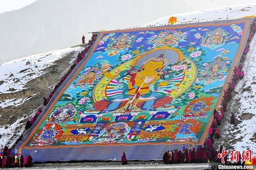 2月22日,甘肃拉卜楞寺举行晒佛节,展晒的巨型文殊菩萨佛像唐卡(图:中新社 杨艳敏)