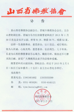 原山西省佛教协会副会长、五台山善财洞住持、晋城白马寺住持隆慧老和尚于2013年1月30日于北京安详舍报,世寿81岁,僧腊56,戒腊52。