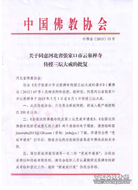 为绍隆佛种,续佛慧命,秉承世尊遗教,光大如来戒法,经中国佛教协会(中佛会[2013]13号)批准,由河北省佛教协会主办、张家口市桥西区佛教协会云泉禅寺承办传授三坛大戒法会(男众部),传戒事项如下: