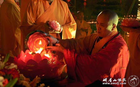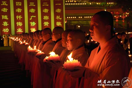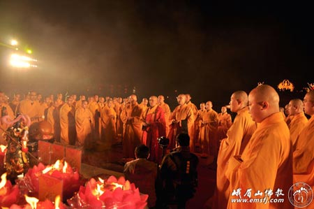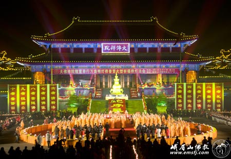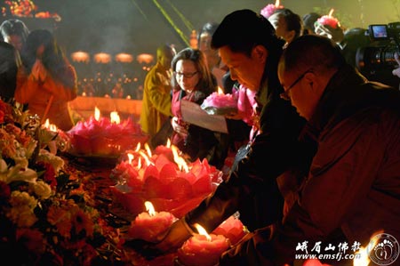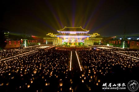 2013年2月23日(农历正月十四)晚,由峨眉山佛教协会主办的“万盏明灯供普贤”大型祈福供灯法会在峨眉山大佛禅院前山门广场隆重举行。参加法会的法师、领导、居士、游人及全市市民共计万余人。