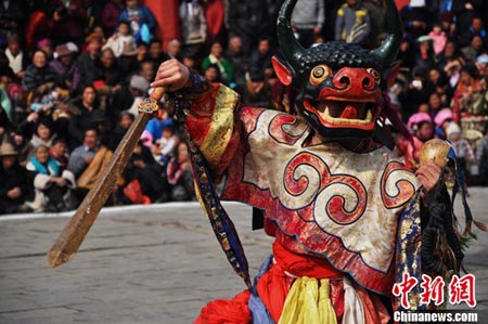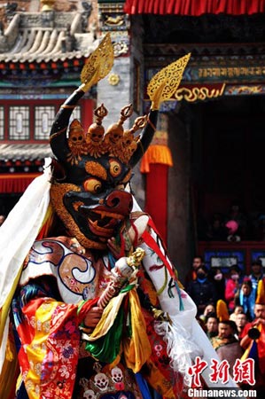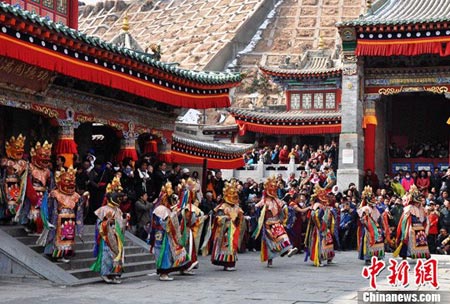 2013年2月23日,藏传佛教格鲁派创始人宗喀巴大师的诞生地——青海省西宁市湟中县塔尔寺举行 “跳欠”仪式。 “跳欠”也被称之为“喇嘛社火”, 是藏传佛教最隆重的祭典活动之一,至今已有三百多年历史。参与“跳欠”表演者均为寺院的喇嘛,他们头戴造型各异的立体面具,身穿色彩艳丽的服饰,在舞钹、牛角号、唢呐等乐器的伴奏下,迈着缓慢、沉稳的舞步出场,场面壮观。