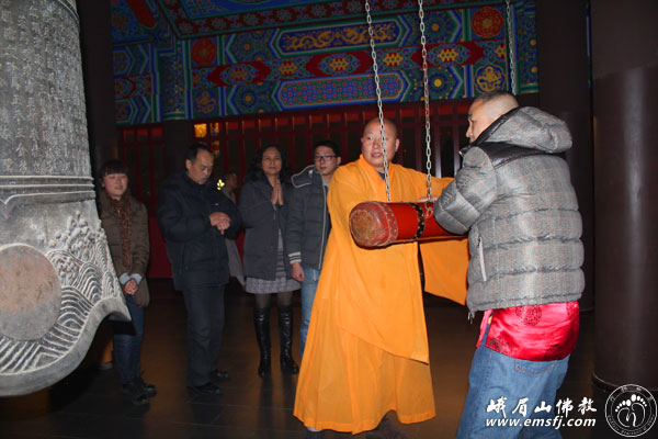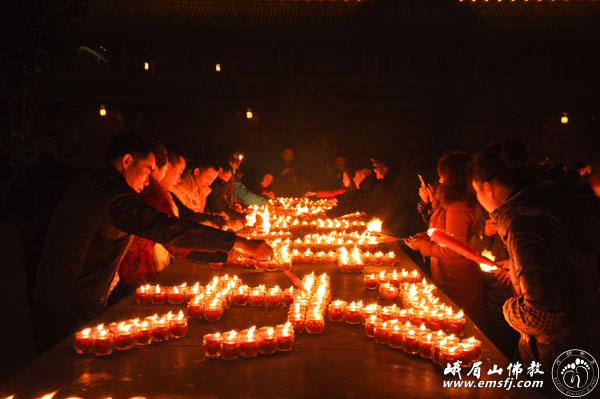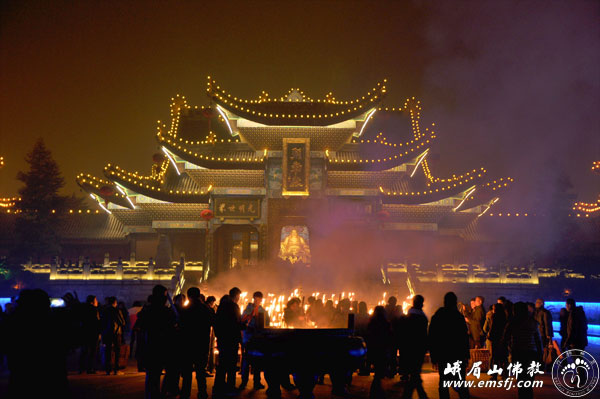 2013年除夕夜,在这辞旧迎新之际,峨眉山寺院内灯火通明、人山人海。无数信众、市民和游人来到寺院,烧香、拜佛、供灯、撞钟,虔诚祈请佛菩萨加持保佑,许下新年愿望。
