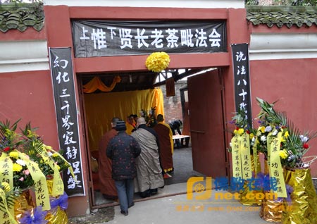 在涂山寺灵堂门口,重庆涂山寺住持、惟贤长老弟子正勇法师带领众法师及居士们进行了庄严的迎请仪式,将长老灵骨安奉于灵堂。