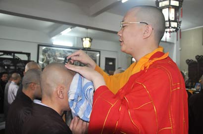 大愿方丈为弟子们剃度(图片来源:广东六祖寺)