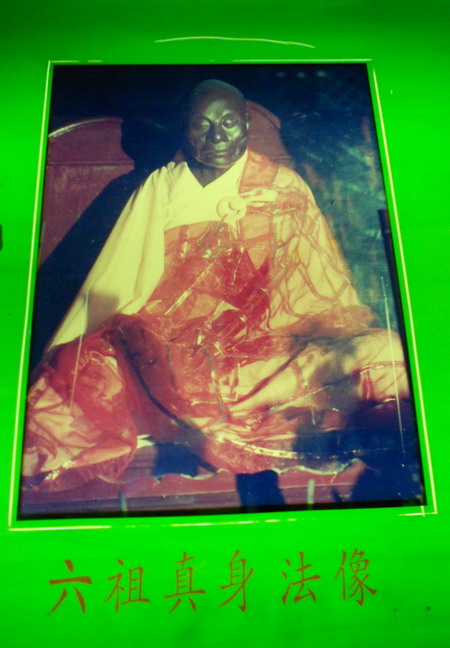 六祖真身像供奉在红墙绿瓦、古色古香的六祖殿内。坐像通高80厘米,六祖慧能结跏趺坐,腿足盘结在袈裟内,双后叠置腹前作入定状。头部端正,面向前方,双目闭合,面形清瘦,嘴唇稍厚,颧骨较高。从塑像中可以看出这位饱经风霜的高僧多思善辨的才智和自悟得道的超然气质,表情生动,栩栩如生。据广东省考古学家徐恒彬、韶关市博物馆和南华寺僧人考证和研究,这座六祖造像的确是以六祖慧能的肉身为基础,用中国独特的造像方法——夹纻法塑造而成。这尊中国式的“木乃伊”是由慧能的弟子方辨塑造的。其方法是,在慧能圆寂前,身披袈裟,尽腿盘屈,打坐入定,不吃不喝,使体内营养和水分逐渐耗尽,最终坐化圆寂。然后将遗体放在两个对盖密封的大缸之中的木座上,座下有生石灰和木炭,座上有漏孔。经过相当时问后,内脏和遗体上的有机物质腐烂流滴到生石灰上,不断产生热气,水份被吸干,遂变成坐式肉身干体。然后进行塑造,先“以香泥上之”,然后加布,再“以铁叶、漆布固师颈”。由于方辨是慧能的弟子,不止一次为慧能塑过像,对他的音容相貌、气质神态有深刻的了解,因此这尊塑像很成功的反映出慧能超脱的气质和高僧的形象,成为流传万古的真身像。