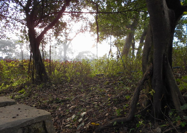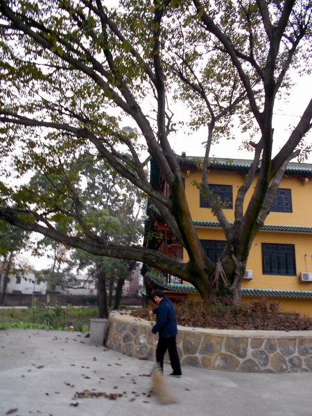 早课香后居士们在打扫禅堂前面广场上古树的落叶,扫地扫落叶,而我们心里的贪嗔痴何尝不象这落叶呢?