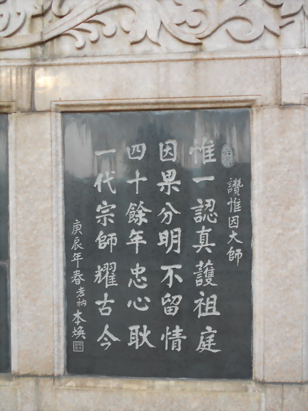 惟因法师青年入道,数十年如一日,学修并重,福慧双修,不仅学为人师,行为世范,而且倾全力培育僧才。南华寺历经「文革」,寺宇破败不堪,他重兴古刹,以续佛慧命。法师生活简朴,淡泊名利,深受四众弟子的爱戴。他把毕生的精力和心血都无私地奉献给了南华禅寺的振兴和佛教事业的发展。于一九九○年五月七日安祥示寂,荼毗后,得赤色和银色舍利多颗。