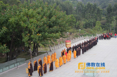 在在护法法师、义工及随喜善信的迎护下全体闭关大众出关