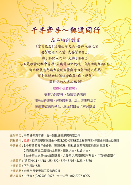 台湾中华佛教青年会将于2013年4月11日至5月30日的每周四举办手牵手与道同行志工培训计划。