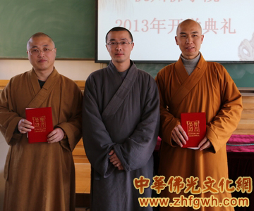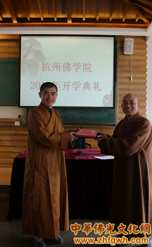 在对新生介绍佛学院的办学历史与概况后,刚晓法师给佛学院2013年受聘的法师与教师颁发聘书。杭州佛学院教理院一年级班主任普铭法师代表受聘的法师与教师接受聘书。之后,慧仁法师给荣获佛学院2012年度的优秀班主任与优秀教师颁发荣誉证书与奖金。荣获2012年度的优秀班主任有:华梵法师、德澄法师。荣获2012年度的优秀教师有:王讯宜老师、心悟法师。之后,杭州市中天竺法净禅寺乘达法师为荣获法净修持奖的学生颁发荣誉证书与奖金。荣获法净修持奖的有:一年级的宽通师、宗卫师、融诚师;二年级的仁慧师、如是师、心戒师;三年级的常德师、演亮师、慧林师;艺术院一年级的思中师、常来师;研究生班的通祥师。之后,杭州市永福禅寺的念顺法师为荣获永福闻思奖的学生颁发荣誉证书与奖金。荣获永福闻思奖的有:一年级的慧清师、宗敬师;二年级的慧明师、悟诚师;三年级的源禅师、源兴师;艺术院一年级的真仁师、陈乾德居士;研究生班的道澈师、亦合师。