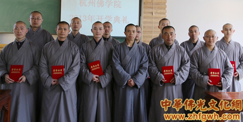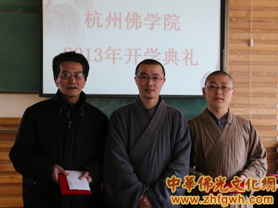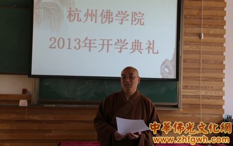 2013年3月4日上午8:30,浙江杭州佛学院师生在法云校区A区讲堂举行2013年开学典礼。出席典礼的有:杭州佛学院常务副院长刚晓法师、副院长慧仁法师以及其它师生,共计130多人。刚晓法师主持开学典礼。