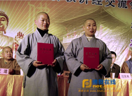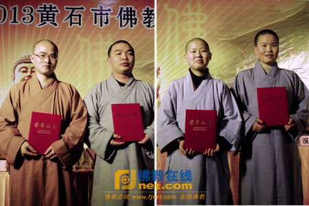 25日上午,在“2013黄石市佛教讲经交流会闭幕式暨颁奖典礼”上,黄石市佛教协会会长演觉法师、黄石市佛教协会常务副会长果慧法师、黄石市民宗局周晓达局长等法师和领导分别为获奖法师颁奖。演向法师、智悟法师、头敏法师获得二等奖,宽德法师、头明法师、头智法师、莲华法师获得三等奖,指永法师、可智法师、头敏法师、真明法师获得黄石市佛教精进弘法法师”荣誉称号,聪敏法师、印三法师获得最佳新人奖,大冶市佛协、黄石港区佛协获得最佳组织奖荣誉称号。
