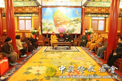 中国佛教协会教务部主任宏度法师、国际部主任普正法师、寺庙工作办公室主任清远法师出席了会见活动。