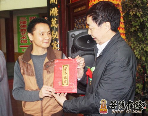 佛教艺术馆馆长张宏林居士向刘清河先生颁发捐赠荣誉书