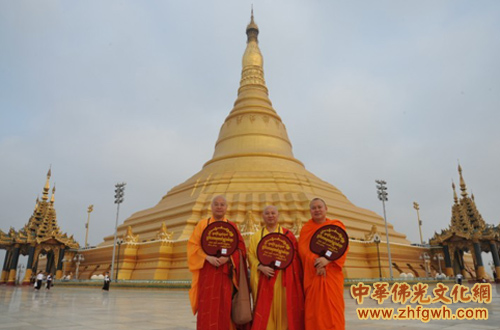 明生法师(中)等在缅甸首都内比都欧巴达丹蒂大金塔前