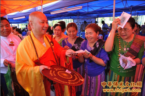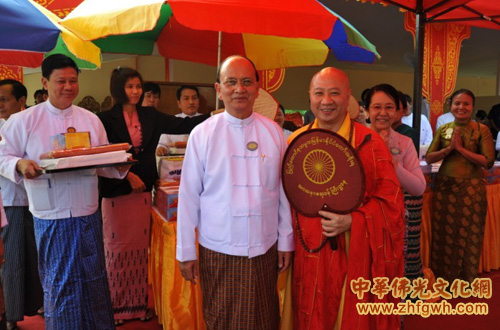 随后的供僧仪式上,明生法师接受缅甸总统吴登盛的供僧并合影