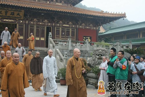 早斋结束后,四众弟子聚集在大雄宝殿广场等待着殊胜时刻的到来,出家师父整齐地排列在大殿之上。七点整,维那师领唱《炉香赞》、《心经》 ,大安大和尚做了简短的开示。大安大和尚说:“希望大家要振奋精神,超越身见小我。忍得一时的疲劳疼痛,一心系念佛号。这次行脚活动是对我们身和同住,见和同解的考验,更是对我们平时修行的一种勘验。只要保持住正念,我们一定能顺利圆满地到达阿弥陀佛的地方。”随后队伍有条不紊地走出东林寺,行脚、礼佛活动正式开始。