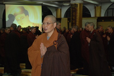 晚间,适逢为期十八天的念佛实修法会圆满结束。大众共发“为利有情愿成佛”的大愿,齐集法堂“跑西方”。