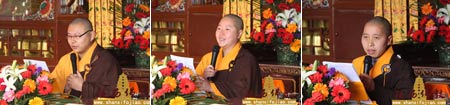 陕西法门寺佛学院宏涛法师宣讲《心经》;西安罔极寺松来法师宣讲《佛说阿弥陀经》;咸阳福圣寺明光法师宣讲《佛说阿弥陀经》(由左至右)