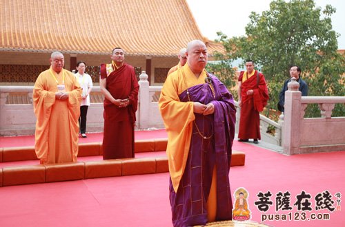 中国佛教协会副会长、海南省佛教协会会长、湖北省佛教协会名誉会长、尼泊尔中华寺、深圳弘法寺、三亚南山寺方丈印顺大和尚领两序大众恭送本老舍利(图片来源:菩萨在线 摄影:心毅)