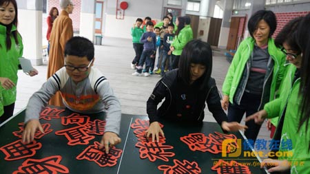 听完故事后,澳门佛光协会工作人员就开始和小朋友玩“曲直向前”游戏节目。最后更要选出代表比赛才可决定胜负。当他们看见满载糖果的朱古力金币奖杯时都禁不住开心兴奋,跳跃起来,有净法师和会长也逐一为他们挂上用两片大大块朱古力金币做成的金牌,当澳门佛光协会一行送上礼物和结缘品之后,小朋友们也开开心心和大家一起合影留念,此次探访活动也随之圆满结束。(文:谭丽琪 图:李金叶)