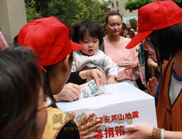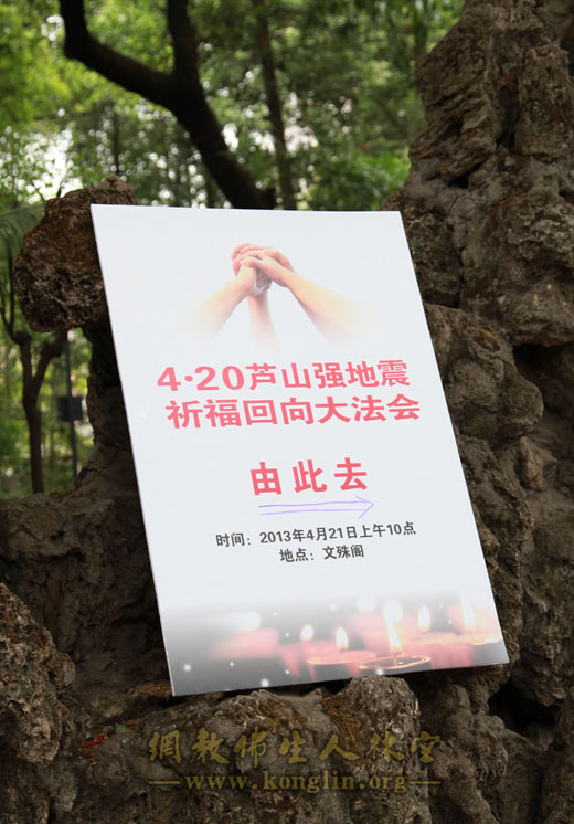 2013年4月21日上午10点,本院的文殊阁内近千名社会各界的爱心人士与成都的众居士随本院僧众一起唱诵炉香赞,诚念观世音菩萨圣号及《大悲咒》、《心经》以此至诚祈佑此次震中的所有生命能得到及时的救护。会中由宗性大和尚开示,大和尚劝慰、鼓励大众:我们所居的国土是脆危无常的,需要大家坚定信心才好勇敢面对;这个突如其来的天灾,激发着每个人慈悲救护的心,而这个心就是救难拔苦、同体大悲的菩萨心;佛教讲心安则国土安,就是说我们的内心和国土息息相连,当我们常怀“向上向善”的菩萨心,那么会给这个世间带来更多的安宁和幸福。将菩萨道的修行落实于真实的生活中,这样才是我们修行人为众生带来的真实福祉。大和尚的开示温暖着大家的心,伴随着这份温暖的力量,僧众与信众踊跃捐款,截止本日下午3点共筹得善款:148848.6元。本院还在寺庙内设定流动募捐点,让每个入寺的人都有机会开启自己的菩萨心。法会同时,义工们迅速采购了近10万元的各类救灾物资,装车即将发往灾区。对于灾区的后续物资救助、心理干预等相关活动恭请关注本院的最新消息。