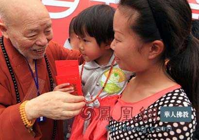 海山老和尚和汶川地震中出生的108罗汉娃在一起(图片来源:凤凰网华人佛教)