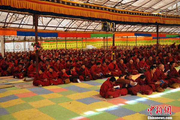玉树各寺院的僧人在诵经。(图:胡贵龙)
