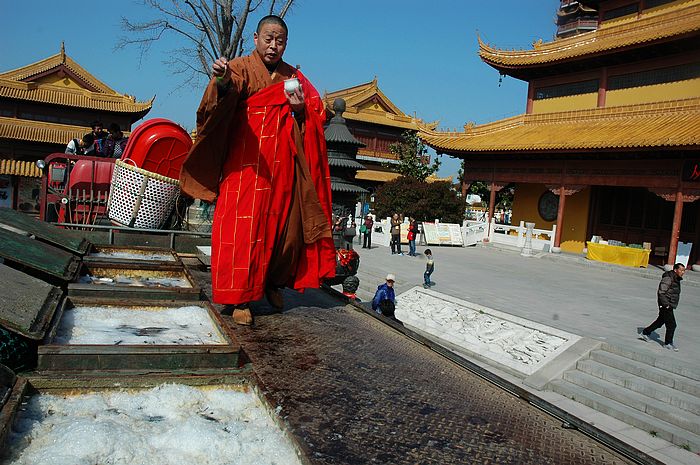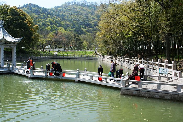 1-灵岩山寺法师不畏辛苦,检查鱼儿存活情况
