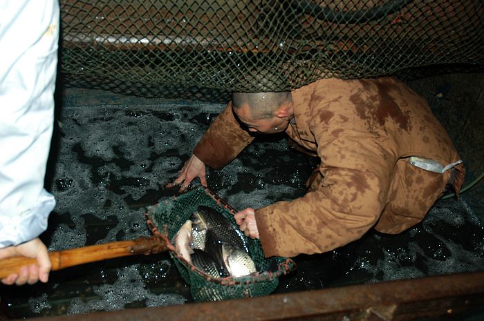 在放生过程中,大家排成两排,轮流传递。一盆盆鱼儿从拥挤的鱼车,被放归到宽广的江湖。他们在水中鱼跃、翻腾、吐着水泡,重获生命的喜悦溢于言表。