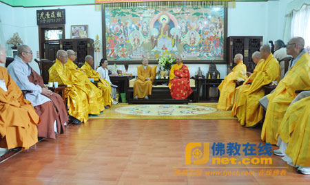 当天上午,韩国求法僧团一行在六祖寺常住法师的迎请下,在大雄宝殿礼佛,然后到方丈楼礼见六祖寺方丈大愿法师,受到大愿法师的热情接待。双方友好交谈,世界禅佛文化(韩国)交流联盟事务长金大植向大愿法师介绍了六祖禅法在韩国的弘扬情况,并一一介绍了此次前来求法的韩国法师。大愿法师随喜赞叹他们为弘扬禅法作出的努力,并邀请韩国法师能够组团前来参加今年的三个大型佛教文化活动,分别是:6月份在香港举行的“世界佛教文化交流联盟”成立大会;9月斯里兰卡举行的“第二届亚洲佛教文化节”,与二十多个国家举行共同祈祷世界和平法会、朝拜佛牙舍利等等;11月在中国浙江举行的华严文化节,随后双方相互赠送礼物。
