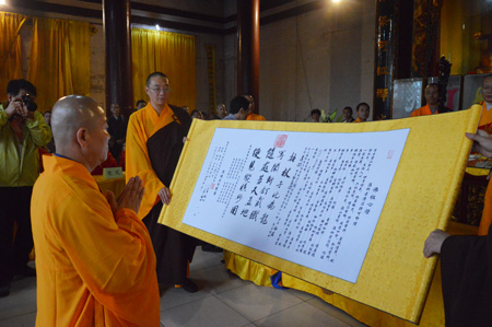 下午2点,韩国法师在六祖寺综合楼二楼禅文化书画艺术展厅进行了书画艺术现场创作。3点,在六祖殿内,举行了隆重而庄严的传法仪式,在中韩大德比丘的共同见证下,大愿法师为8位韩国比丘僧尼授予了法卷。其中3位韩国比丘传承了沩仰宗的法脉,成为沩仰宗第十一代传人;5位韩国比丘尼传承了曹洞宗的法脉,成为曹洞宗第二十六代传人。大愿法师亲自为8名韩国禅师披祖衣,送衣钵,付法偈,开示法要,期望韩国禅师回国能住持正法,弘法利生。当天在六祖寺大雄宝殿,大愿法师还为求法团随行的多位韩国居士以及部分中国居士传授了五戒。晚上,在六祖寺素菜馆举行欢送晚宴,在晚宴上韩国与六祖寺的居士分别为大家表演了精彩优美的佛教舞蹈,赢得了大家的热烈掌声。