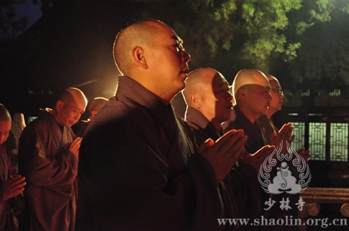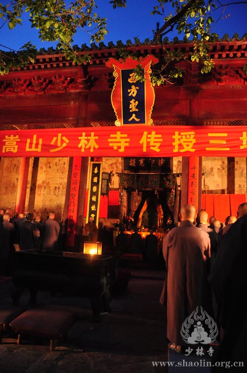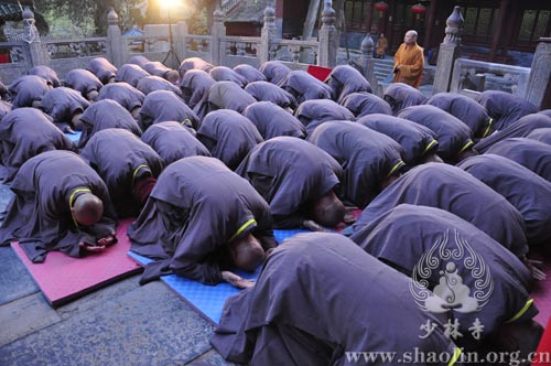 晚上七点,全体新戒在少林寺西方圣殿礼通宵,礼佛忏悔,虔诚礼拜一整夜。