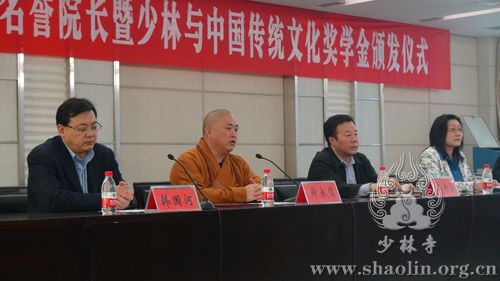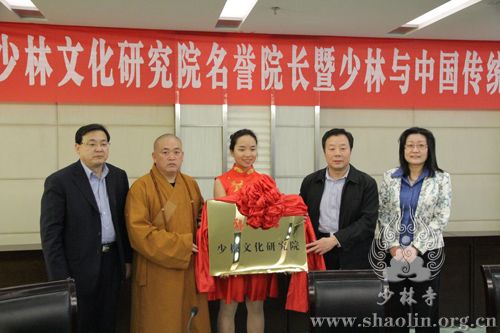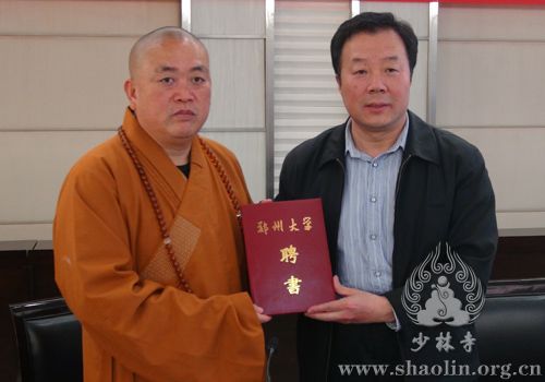 2013年4月15日下午,河南嵩山少林寺方丈永信法师受聘郑州大学少林文化研究院名誉院长暨少林与中国传统文化奖学金颁发仪式在郑州大学新校区举行。郑州大学高丹盈副校长,郑州大学学位办杨云香主任及郑州大学历史学院、少林文化研究院韩国河院长一起出席了仪式。