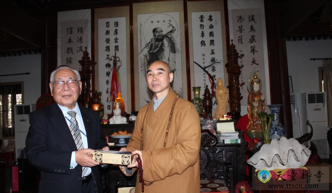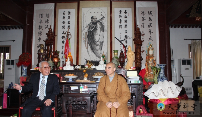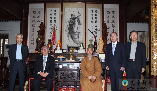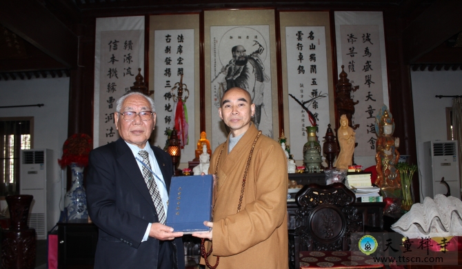 2013年4月11日上午10时,日中友好协会本部副会长、福井县日中友好协会会长酒井哲夫一行4人,至曹洞宗祖庭天童禅寺拜访诚信大和尚,同行的还有大野市日中友好协会副会长寺坂哲夫,宁波市市外办于莹陪同并担任翻译。