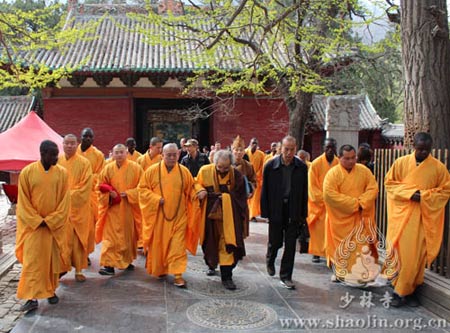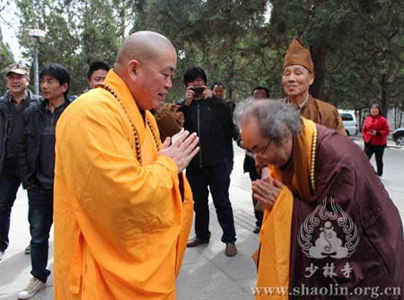 在永信法师的陪同下,平冈嘉卫门先生一行五人认真地参观了少林寺常住院的建筑、碑刻、壁画等文化遗产,对少林文化的厚重博大赞不绝口。参观寺院期间,平冈先生一直虔诚地躬身,激动欣喜地握着永信法师的手,对永信法师一直以来对日本禅画协会的关心与支持表示衷心地感谢。